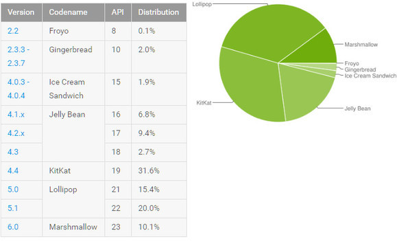 Az év első részében számos csúcskészülék és alsóbb kategóriába eső mobil kapta meg a 6.0-s Android rendszerverziót, így két hónap alatt megtriplázódott a mályvacukros variáns részesedése a zöld robotos eszközök körében. Az elmúlt hónapban nem sikerült a terjedés ütemét tovább növelni: 7,5%-ról 10,1-re nőtt a Marshmallow részesedése.