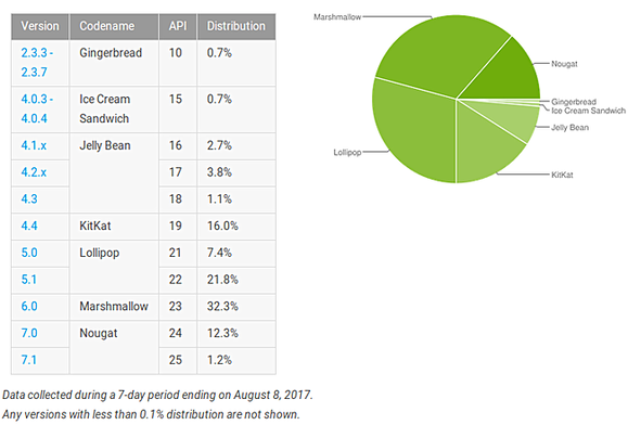 A Nougat ugyan két százalékpontos erősödést tud felmutatni, viszont a 7.1.1-es verzió 1,3% százalékát hozzáadva sem éri el a KitKat 16%-os jelenlétét. A legkorábbi szoftververziók meglepő módom még mindig nem csúsztak be a statisztikai hibahatár alá, így mérhető, bár nagyon alacsony arányban vannak jelen a piacon, de legalább stagnálnak. Ezzel szemben a Marshmallow az elmúlt két hónapban némiképp erősödött is. A statisztikák nem mozdulnak szignifikáns mértékben, annak ellenére sem, hogy az Android 8.0 elvileg a héten startol.