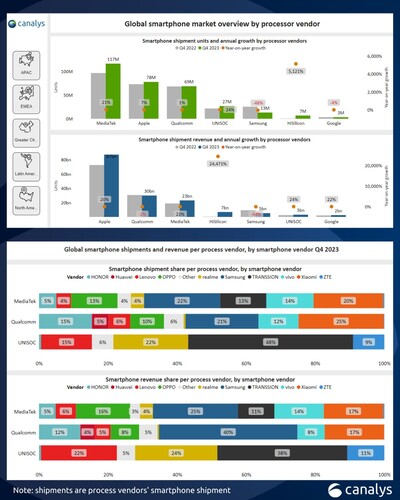 Összesítették az okostelefonokba SoC-kat fejlesztő cégek által leszállított lapkák számát a 2023-as negyedik negyedévre vonatkozóan a Canalys piackutatónál, az eredmények pedig a MediaTek győzelmét mutatják. A piackutató szerint a Q4-ben a Dimensity 9300-zal jelenleg a legerősebb mobilchip címét is birtokló MediaTek 117 millió darab SoC-t szállított le a 2023-as Q4-ben, míg az Apple 78 milliót, a harmadik helyen álló Qualcomm pedig 69 milliót. A MediaTek így +21%-os éves növekedést tudott felmutatni darabszámban és +22%-os volt nyereségük mennyisége az előző év adott szakaszához képest. Ezt 23 milliárd amerikai dolláros bevétellel könyvelhette el a cég, viszont ez is kevés volt az első két helyhez.