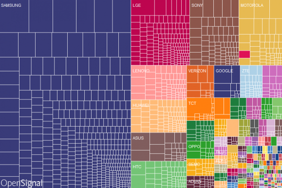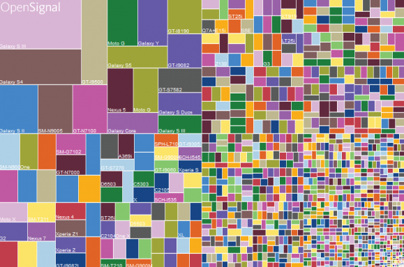 Az Open Signal felmérése egyébként nem számít rendkívülinek ha az nézzük, hogy 1294 kisebb- olyan vállalat van a világon, akik vagy gyártással, vagy értékesítéssel foglalkoznak. Érdekesség, hogy a fent említett 24093 eszköz 37,8 százalékán Samsung logó található, ami figyelemreméltó eredmény, bár a tavalyi esztendőhöz képest a koreai cég esetén 5,2 százalékos visszaesést jelent. Az alant látható kép az eszközök eloszlását, töredezettségét mutatja, ergo hogy mely készülékek mekkora számban kerültek értékesítésre: