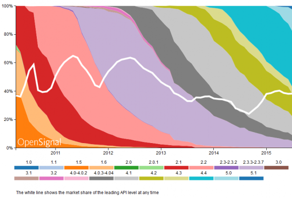 Az Open Signal riportja számba vette az Android operációs rendszereket is (első kép), eszerint a 0,3 százalékkal rendelkező Froyo tényleg nem akar eltűnni a táblázatokból, pedig egy 2010-es szoftverről beszélünk. A Lollipop persze egyre nagyobb szeletet harap ki magának, ám lassan megérkezik az Android M, ami még jobban szétszakíthatja majd a különböző Android rendszert futtató készülékeket.