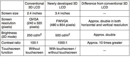 A Sharp már tavaly is piacra dobott egy kifejezetten mobiltelefonokba szánt 3D érintőkijelzőt, ám az idei frissített változat gyakorlatilag minden téren túlmutat elődjén. A vízszintes üzemmódban 2D és 3D tartalmak megjelenítésére is alkalmas, 3,4 hüvelykes képátlójú és 854x480 képpontos megjelenítő a négyzetméterenként 500 kandela fényességű háttérvilágítás előtt elhelyezkedő optikai rács segítségével tereli egy-egy képpont oszlop fényét a jobb illetve a bal szem felé, vagyis tökéletesen szemből nézve a térbeli megjelenítés szemüveg nélkül is biztosítható. A telefonokba és más hordozható eszközökbe szánt panelek érintőkijelzős és hagyományos kivitelben is elérhetőek lesznek, így a Japánban népszerű kagylómobilokban és az Európában sikeres érintőkijelzős modellekben is elérhetővé válhatnak. A Sharp egyelőre nem közölt sem konkrét árát, sem pedig várható megjelenési időpontot, de piaci elemzők szerint a következő években a 3D megjelenítők, 3D kamerák és a projektorok lesznek a csúcsmodellek új kiváltságai.