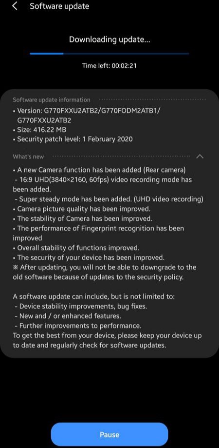 Az S10 Lite 416MB frissítéssel elérhető új firmware-je (G770FXXU2ATB2) viszont lehetőséget ad a Super Steady mód használatára UHD felbontáson is, amivel az S10 Lite hirtelen olyan képességre tesz szert, amit a csúcsszéria sem tud felmutatni. Még az S20 Ultra sem. A frissítés tartalmazza egyébként a februári biztonsági protokollt, UHD opciót 16:9-es képarány mellett, a Fényképek minőségének javítását, illetve a Kamera stabilitásának növelését, ami reméljük, hogy a fókuszpróblémákat orvosolja, előbbi pedig a durva zajszűrést mérsékli.