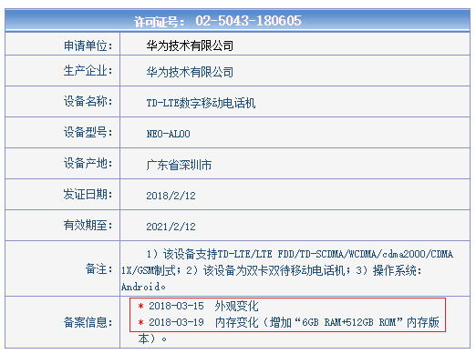 Jövő héten mutatkozik be a Huawei csúcsszériájának idei kiadása, viszont eddigi értesüléseink alapján egyik eszköz sem várható 128 GB-nál nagyobb belső térhellyel. A kínai Hírközlési Hatóság adatbázisában viszont feltűnt egy NEO-AL00 cikkszámú készülék 6 GB operatív memóriával és 512 GB raktérrel. Az elírás lehetőségét azért vetik el többen, mert a tárhelykiosztásra vonatkozó adatokat az eredeti hitelesítési kérelem után módosították külön kérésre.