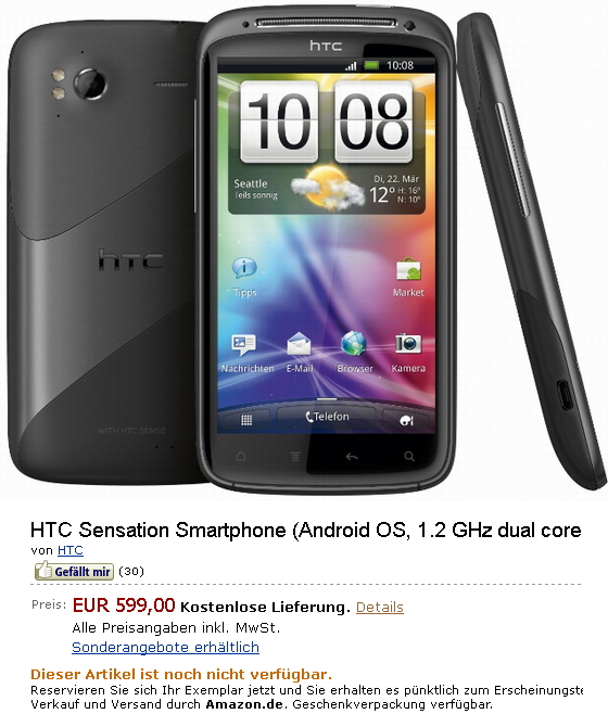A brit és a német Vodafone kínálatában május 19-én debütáló HTC Sensation az Amazon oldala szerint rövidesen kártyafüggetlen változatban is elérhető lesz, méghozzá a hasonlóan felszerelt Samsung Galaxy S II-nél is valamivel drágábban. Az 599 euróért, azaz körülbelül 159 000 forintért kínált jövevény a nyugat-európai szolgáltatók kínálatában ingyen is elvihető lesz, természetesen részletfizetéses konstrukcióban. Az Android 2.3.3 Gingerbread alapú, 126,1x65,4x11,3 milliméteres és 148 grammos HTC Sensation 4,3 hüvelykes, 540x960 képpontos (qHD) Super-LCD érintőkijelzőt, 1080p felbontású HD anyagok rögzítésére alkalmas 8 megapixeles fő és VGA előlapi kamerát, GPS, WLAN (802.11b/g/n) és sztereó Bluetooth 3.0 modult, digitális iránytűt, 14,4/5,76 megabites HSPA átviteli képességet, 1,2 GHz-es kétmagos Qualcomm Snapdragon MSM8260 processzort, Adreno 220 grafikus gyorsítót, 768 MB RAM-ot, 8 GB belső tárhelyet, microSDHC bővítőhelyet, RDS FM rádiót és 8 óra beszélgetést biztosító, 1520 mAh kapacitású akkumulátort kapott.