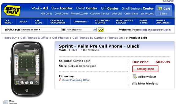 A Palm első webOS alapú készüléke, a Palm Pré június 6-án debütál hivatalosan az Egyesült Államokban, méghozzá 100 dollár visszapostázása (mail-in rebate) után 199,99 dolláros előfizetéses áron, vagyis a vásárláskor 299,99 dollárt kell érte kifizetni, de ebből 100 dollár visszajár. A hírek szerint a BestBuy kínálatában a telefon eleve 199,99 dollárért lesz elérhető, legalábbis előfizetéssel. Kártyafüggetlen modell vásárlása esetén a helyzet közel sem ennyire kedvező, ugyanis a bolt online katalógusában jelenleg 849,99 dollárért rendelhető elő a jövevény, mely pontosan 150 dollárral több, mint termékpalettájának csúcsmobilja, a lényegesen jobb technikai paraméterekkel kecsegtető Nokia N97.