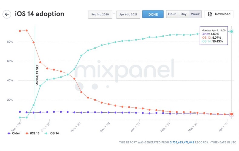 Fontos tudni, hogy ez még nem a gyártó által alátámasztott érték, hanem a MixPanel közléseiből származik, az Apple által publikált adat szerint most 80%-on áll az összes aktív eszközből az iOS 14-et futtatók aránya, ha csak az utóbbi 4 évben bejelentett készülékeket vesszük alapul, akkor pedig 86%-on állunk. Akárhonnan is nézzük, szép eredmény, amit az androidosokkal nem lehet, de nem is kell összehasonlítani, mindazonáltal örömteli, hogy nem csak a frissítési lehetőség, hanem a kedv is töretlen a felhasználók részéről.