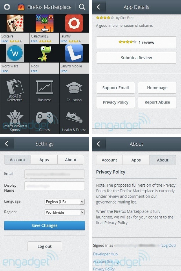 A Mozilla eredetileg „Boot to Gecko” néven megismert, majd később Firefox OS néven bejelentett telefonos operációs rendszere az előzetes információk szerint 2013 első felében láthat napvilágot, melyhez természetesen a kor igényeinek megfelelően online alkalmazásbolt is tartozik majd. Az Engadget által publikált képek alapján úgy tűnik, hogy a telefonos piactér nem az asztali számítógépekhez szánt Mozilla Marketplace alapjaiból építkezik, sőt a legtöbb konkurens megoldástól eltérően az indító képernyő azonnal a kívánt kategória kiválasztásával kezd és nem a legnépszerűbb alkalmazások listájával árasztja el a felhasználót. A gyors működésre fókuszáló, kissé minimalista online áruház egyelőre csak ingyenes katalógussal bír, de később biztosan prémium alkalmazásoknak is helyet ad majd, vagyis előbb-utóbb a Mozillának is meg kell állapodnia majd a szolgáltatókkal, illetve a visszafizetési problémákkal és reklamációkból eredő nehézségekkel is számolnia kell.