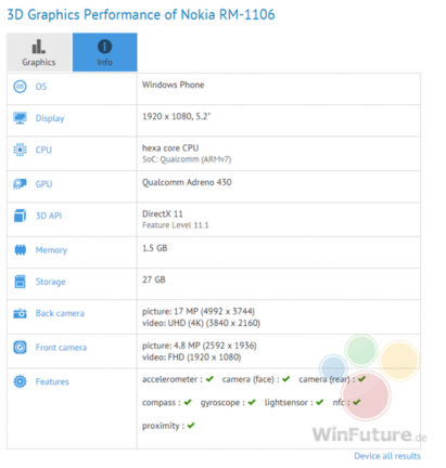 A GFX Benchmark szintetikus tesztprogram már számos be nem jelentett készüléket buktatott le, a szoftver adatbázisában pedig egy újabb, egyelőre ismeretlen eszköz bukkant fel, méghozzá RM-1106 modellszámmal megjelölve. A leírás szerint a Windows Phone operációs rendszert futtató masina 5,2 hüvelykes, Full HD felbontású kijelzővel rendelkezik, a hardveres erőforrást pedig egy 64 bites architektúrájú, hatmagos processzorral és Adreno 418 grafikus gyorsítóval (a dokumentum 430-at ír, de ez lényegében lehetetlen ebben a felállásban) felvértezett Snapdragon 808 SoC biztosítja.