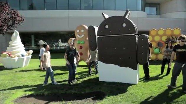 A hagyományoknak megfelelően a Google egy hatalmas plasztikszobor felállításával ünnepelte a közelgő Android 4.0 Ice Cream Sandwich premierjét, mely kicsomagolási folyamata egy „unpacked” videó keretében rögzítésére is került. Az új platform eredetileg október 11-én, azaz most kedden debütált volna a Nexus Prime fedélzetén, ám technikai okok miatt erre legkorábban csak jövő szerdán kerülhet sor. A keresőóriás kaliforniai központjában felállított szobor a „Honeycomb” és „Gingerbread” figurák között helyezkedik el, ezzel is utalva a mobiltelefonos és táblagépes platformok egyesítésére. Az Android 4.0 egyik legnagyobb dobása a hagyományos gombokat teljes mértékig mellőző kezelőfelülete lehet, melyben a billentyűk szerepét a hatalmas HD kijelzőn megjelenő virtuális kezelőszervek vehetik át.