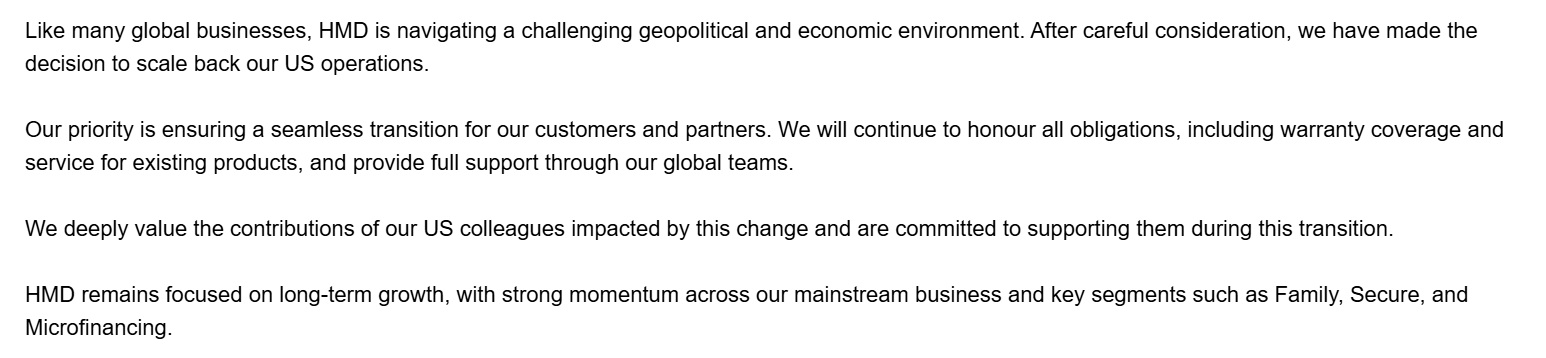 A HMD közleményében az embert próbáló geopolitikai és gazdasági helyzetre hivatkozik a visszalépés mögötti indokként. Hozzáteszik, a már piacra került készülékek garanciális hátterét biztosítják, ugyanígy a szoftveres támogatást is a nemzetközi fejlesztőcsapatok munkáját felhasználva. Az amerikai alkalmazottak kapcsán azt írják, segítik őket a változás során, az kérdéses, hogy ez elbocsátást vagy más országokban dolgozó csapatokhoz történő átszervezést jelent-e. A HMD hozzáteszi közleménye végén, hogy továbbra is a hosszú távú növekedésre fókuszálnak majd. Az USA-ban a HMD összesen négy telefonnal volt jelen, köztük a Skyline-nal és a Barbie telefonnal.