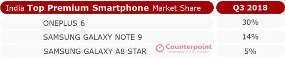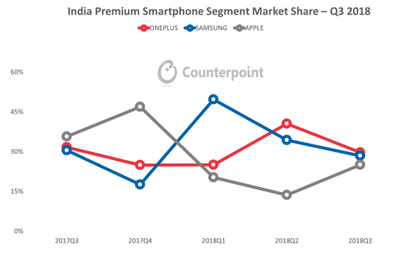 Az indiai piac jobbára a belépő szintű és alsó középkategóriás készülékekre tart igényt, ebben a szegmensben a Xiaomi már az globális világelső Samsungot is lenyomta. Ugyanakkor Indiában is van igény a prémium modellekre, ami a 400 dollár fölötti összegbe kerülő mobilokat takarja. De itt sem a Samsung a piacvezető. A Counterpoint elemzése alapján 2018 Q3 top három gyártója a csúcskategóriában továbbra is a OnePlus, a Samsung és az Apple; együtt a 83%-át fedik le a kategóriának.