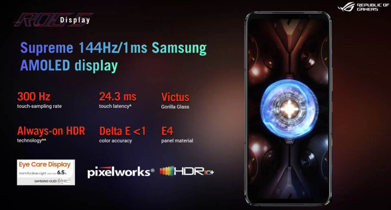 A kijelzőt a Samsungtól veszi az ASUS, egy 6,78 inches AMOLED panelről van szó, a felbontás maradt Full HD+, a képfrissítés 144 Hz-es, az érintésérzékelés 300 Hz-es, HDR10+ szabványt is tud. A gyártó PR vezetője újságírói kérdésre elmondta, hogy azért nem mentek QHD-ra, mert ott már a Snapdragon 888 és a 6000 mAh-s akkumulátor bizonyos esetekben nem lenne elég. Természetesen továbbra sincs kameralyuk, viszont alul-felül azért van valamennyi káva, ami miatt most nem panaszkodunk, mert a fektetett nézetű játékoknál fontos, hogy meg lehessen úgy ragadni a masinát, hogy az ujjunk nem lóg bele a kijelzőbe.