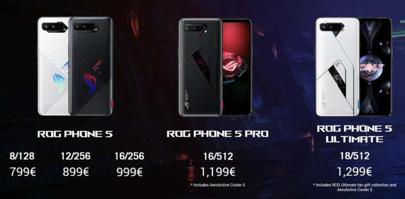 A ROG Phone 5 több verzióban lép piacra, először (még márciusban) az alapmodell lesz kapható, ahol a legkisebb kiszerelés 8 GB RAM-ot és 128 GB belső tárhelyet kap. Ez utóbbi nem bővíthető. A következő szint már 12/256-os változat, a sima ROG5 csúcsa pedig a 16/256-os ajánlat. Ha ennél többre vágyunk, akkor áprilisban jön a ROG Phone 5 Pro, ahol a hátlapon is lesz egy pici OLED kijelző, kizárólag dekorációs célokkal és alapból jár hozzá venti, ez szintén 16 GB RAM-ot és 256 GB tárhelyet kap, majd májusban nagyon limitált számban érkezik a ROG Phone 5 Ultimate, ami matt fehér készülékházat, ventilátort és egy gazdag ajándékcsomagot is kínál mindenféle ROG relikviákkal.