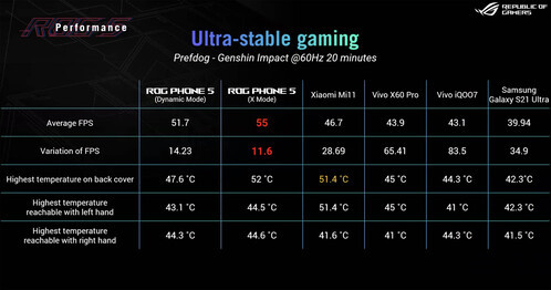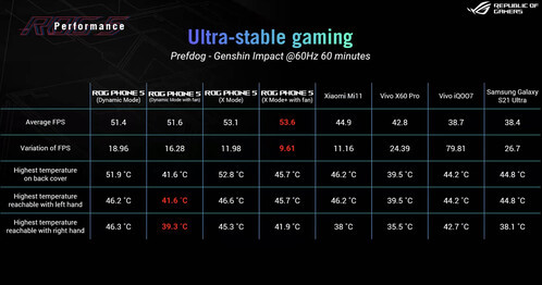 Az ASUS rengeteg tesztet végzett a saját laborjában a melegedés kapcsán, összehasonlították a friss ROG Phone 5-öt a konkurens és kurrens modellekkel, mutatunk két táblázatot a témában: