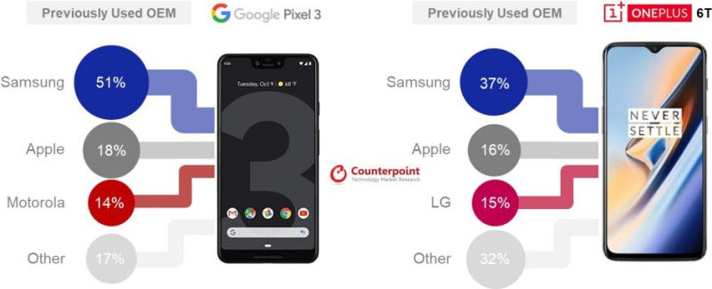 A piackutató cégek egészen érdekes eredményeket kaptak, a Strategy Analytics például megállapította, hogy az Egyesült Államok leggyorsabban feltörekvő okostelefon brandje a Google Pixel, a Counterpoint adatai szerint pedig az amerikai piacon 2018 utolsó negyedévében a OnePlus 6T a top ötbe került a prémium kategóriában. De az is érdekes kérdés, hogy kinek a tortáját eszegeti a két gyártó. A Counterpoint ezt is megnézte.
