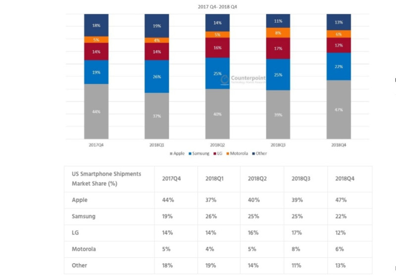 Azért nem kell félteni az USA-ban két legnagyobb gyártónak számító vállalatot sem. 2018 utolsó negyedévében az Apple szállította a készülékek 47%-át, míg a Samsung 22%-kal zárta az évet. A koreaiak esetében ez 3%-os növekedés éves viszonylatban, év közben viszont voltak jobb eredményeik, főleg az Apple rovására. Az LG és a Motorola nagyjából kiegyensúlyozott teljesítményt mutat, előbbi 12-14% között, utóbbi 5-8%.kal.