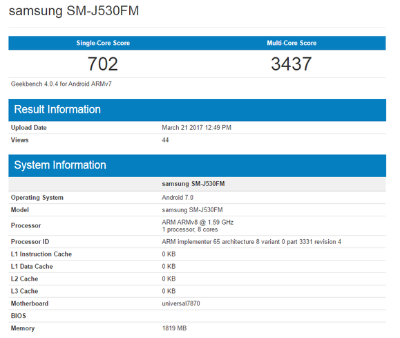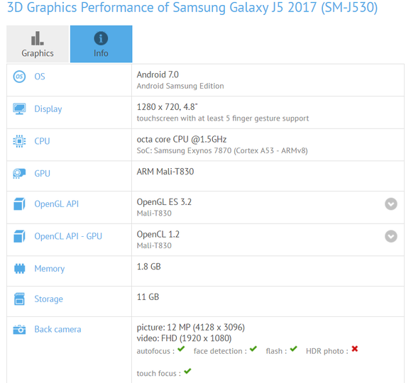 A Galaxy J5 (2016) utódja úgy tűnik, házi lapkakészletet kap, valószínűleg az Exynos 7870-es formájában, amihez ismét 2 GB rendszermemóriát mellékeltek. Az újdonság abban áll, hogy a mostani eredmények már 7.0-s rendszert mutatnak. Megegyezően a GFX Bench adataival, ahonnan az is kiderül, hogy mindkét kamera 12 megapixellel dolgozik majd.