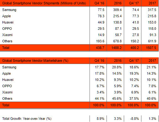 Ennek ellenére valamennyivel kevesebb iPhone indult útnak az üzletek felé, mint korábban, ugyanígy a Huawei és a Samsung mutatói is romlottak a negyedévben, míg az Oppo megismételte 2016 végének eredményeit. A negyedév és 2017 igazi nyertese a Xiaomi: októbertől december végéig 27,8 millió telefonjuk került leszállításra, majdnem ráduplázva 2016 hasonló időszakára, és bár 100 millió darab okostelefont nem sikerült útnak indítani az esztendő egészében, 50%-kal nőtt piaci részesedésük, a 4. pozíció pedig látótávolságba került. Igaz, az Oppo is erősített éves szinten, akárcsak a Samsung és a Huawei, míg némileg csökkent az Apple részesedése. Ami az éves leszállításokat illeti, a Strategy Analytics úgy becsüli: 1,507 milliárd darabbal épphogy sikerült túlteljesíteni 2016-ot, ám a tendenciák a piac szűkülése felé mutatnak.