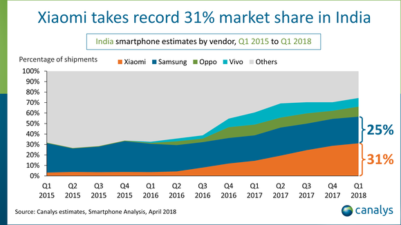 A Canalys elemzése alapján a Xiaomi rekordot döntött az idei első negyedévben a leszállított készülékek tekintetében. Éves összevetésben 155%-kal növelte piaci jelenlétét, ami nagyjából 9 millió készüléket jelent, ezzel a piac 31%-át fedi le, amely megközelíti a Samsung 2014 Q1-ben elért 33%-os rekordját. Kína után az indiai piac a legjelentősebb, amit második negyedéve zsinórban a Xiaomi dominál, míg a Samsung 25% körül stagnál.