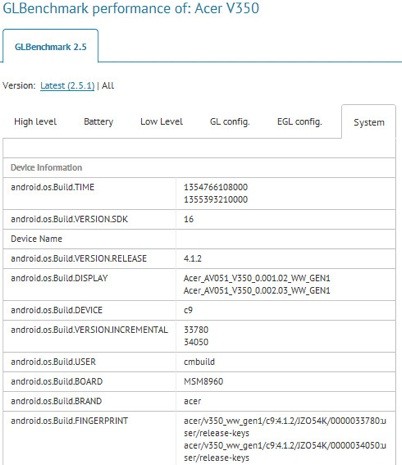 Az elmúlt hetek során több alkalommal is hallatott magáról az Acer V360, mely külső formatervét néhány kémfotó leplezte le. Az Engadget forrásai szerint a gyártó jövőre számos további készülék leleplezését is tervezi, melyek közül furcsa módon a V350 jóval erősebbnek tűnik, mint a magasabb sorszámú fivére. A GLBenchmark eredményei között felbukkant modellről egyelőre csupán annyit tudni, hogy Android 4.1.2 Jelly Bean operációs rendszer köré épül, mely mellé 720 x 1280 képpontos kijelzőt és 1,5 GHz-es órajelen futó Qualcomm Snapdragon S4 processzort kapott. Az előzetes pletykákat persze nem árt komoly fenntartásokkal kezelni, hiszen az eredmények meghamisítása nem túl bonyolult feladat, de ha mégis valódi készülékről lenne szó, akkor az legkésőbb a februári Mobile World Congress során biztosan leleplezésre kerül.