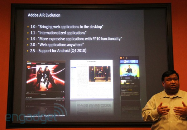 Az Adobe Flash 10.1 debütálását az év végén az Adobe AIR premierje követheti, mely jóval nagyobb hardverigényű, platformfüggetlen 3D alkalmazások fejlesztését és futtatását is lehetővé teszi. Az Adobe szóvivője szerint a Flash 10.1 futtatására alkalmas Android 2.2 alapú modell zöme a jövőben Adobe AIR szoftverek futtatására is képes lesz, ám ez utóbbi esetben az ARMv7 utasításkészletű processzor, vektoros műveletek gyorsítását segítő társprocesszor és az OpenGL ES 2.0 kompatibilis grafikus gyorsító jelenléte már kötelező érvényű lesz. A telefonok kameráját, mikrofonját, gravitációs szenzorát és GPS vevőjét is kiaknázó szoftverek fejlesztését segítő Adobe AIR a jövőben más platformok számára is elérhetővé válhat.