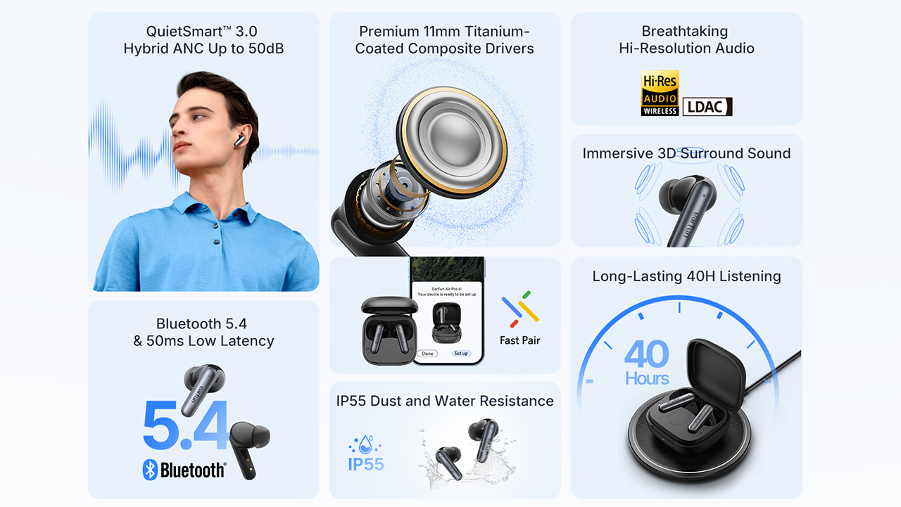 A másik újdonság már egy új termék. Az Air Pro 4i a termékvonal legfontosabb kritériumait megtartotta, viszont spórol kicsit a hardveren és az olyan extrákon, mint az AI fordítás. A fülhallgató IP54-es szigetelést kapott, kialakítása inkább az Air Pro 4-re hasonlít, mint a Plus változatra. Fontos különbség az is, hogy a Qualcomm hangchip híján nincs benne aptX támogatás, SBC és AAC mellett csak LDAC-n keresztül kommunikálhat. A membránok is a régebbi EarFun modellekből ismert 11 milliméteres titán bevonatú modellek, nem a kettős újak, így a tapasztalataink alapján előre merjük vetíteni, hogy kissé fémesebb hangzása lesz ennek a modellnek.