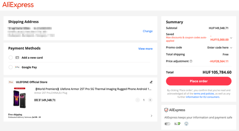 Az első félév eddigi legnagyobb akcióját tartja az Ulefone a márka hivatalos boltjában az AliExpressen. A leárazás június 17-én hétfőn kezdődött, június 23-mal zárul majd, a kedvezményes ár pedig nem csak a már régebbi mobilokra vonatkozik, hanem a legújabb modellekre is. Ilyen például az Armor 25T Pro, ami az 5G-s adatkapcsolat mellett infrakamerát és hőkamerát is biztosít az ütésálló házban. Ez 149 ezer forintért rendelhető jelenleg az akció keretén belül, de ha átböngésszük ezt az oldalt a nyári leárazás alatt, akár találunk még olyan kuponkódot (például nálam a 24SS40 működött a kosárban), még tovább nyomhatjuk lefelé a végösszeget. Nekem a fentebbi kód bepötyögésével, illetve az AliExpress automatikusan elfogadott egyéb kedvezményeivel együtt végül 105 785 forintra jött ki a kosár végösszege magyar címre történő szállítást kérve az Armor 25T Pro 5G esetén, lásd a lentebbi képet.