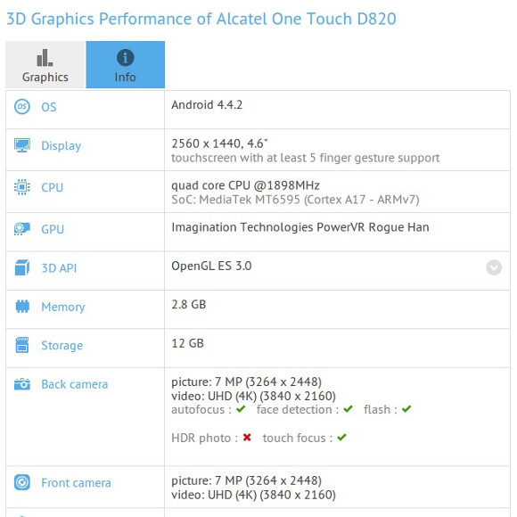 A legtöbb konkurens modelltől eltérően az Alcatel csúcsmobilja nem Qualcomm, hanem 1,8 GHz-es négymagos MediaTek MT6595 processzor köré épül majd, mely mellé 2,8 GB RAM és 12 GB belső tárhely is rendelkezésre áll, mely utóbbi valójában 16 GB lehet, melyből 4 GB az operációs rendszer számára elkülönítésre került. Az Alcatel D820 további érdekessége az elő- és hátlapi 7 megapixeles kamerája lehet, melyek a GFXBench adatlapja szerint 4K videók rögzítésére is alkalmasak. Az Android platform 4.4.2 KitKat verziójával érkező készülék piaci pre ierjének időpontja egyelőre nem ismert.