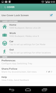 A Cover alapvetően két nagyobb részre bontható: a kijelzőzárra és a bárhonnan előrántható gyorsmenüre. Előbbi értelemszerűen a gyári lockscreent cseréli le egy egyedi megoldásra. A bal szélén hat ikon sorakozik (ezek között egy fügőleges mozdulattal lehet váltani), az alkalmazás az Aviate-hez hasonlóan figyeli a felhasználói szokásokat, az aktuális tartózkodási helyet és az időt, melyek kombójának megfelelően kiválogatja a leginkább passzoló programokat. Az alkalmazás egyébként négy módot definiál: otthoni, munka, autó vagy szórakozás; ezek a parancsikonok mellett a háttérképre is hatással vannak. Jópofa, hogy a készüléket fektetett orientációban használva a jobb felső sarokban a kamera gyorsindítója is febukkan, mely nem látható álló nézetben. Igen jól mutat továbbá az alkalmazások indítása, melyeket nem egy szimpla érintéssel, hanem a háttérképet a megfelelő ponton elhúzva érhetünk el.