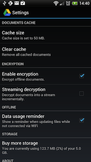 A cikkünk apropója, hogy a Drive mellé kapásból két okostelefonos kliens is érkezett, melyek Android (2.1, vagy újabb) és iOS (5.0, vagy frissebb) platformon érhetőek el. A két alkalmazás felépítése és a kapcsolódó szolgáltatások nagyon hasonlóak, az eltérés a megjelenítésben rejlik, mindkettő az adott platformra jellemző grafikai megoldással operál. A főoldalon a főbb funkciókat érhetjük el, mint a saját tárhely, a megosztott, nemrég használt vagy kiemelt dokumentumok, illetve az offline is elérhető anyagok. Utóbbi igen hasznos: míg a felhő alapú tárhelyszolgáltatások jellemzően internetkapcsolat alapon működnek, a Drive-ban kapcsolat nélküli munkára is van lehetőség, ehhez egyszerűen offline módba kell rakni az adott erőforrást; a szinkronizálás természetesen ezután is megoldott. A beállítások között néhány extra opciót is találunk, például titkosítani is tudjuk az offline dokumentumokat.