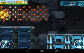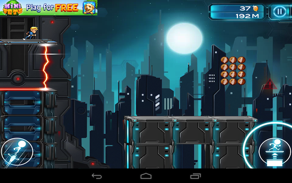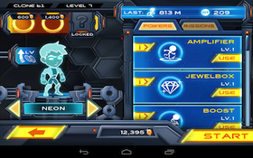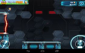 Az első pár perc során viszont csalódottan konstatáltam, hogy a játék menete eltér az elődtől. Míg az első epizód során a képernyőt megérintve a gravitáció irányát tudtuk megváltoztatni (azaz hősünk vagy a plafonon, vagy a padlón futkorászott), most úgynevezett liftekeket lehet megemelni, ezáltal a főszereplő ugrik egy nagyot. Erre képes a jobb alsó sarokban lévő virtuális gomb, a bal szomszédját megérintve egy kisebb löketet kap hősünk, amennyibem éppen a levegőben tartózkodik. Persze történetet is kapunk (a gravitációs törvényeket megszegő világban bátor hűsünket fogva tartják a rendszer elleni lázadásért, de megszökik és most az életéért menekül), de ezt tényleg csak átfutni érdemes. Leginkább egyébként a Jetpack Joyride alkalmazást juttatta eszembe a Gravity Guy 2: a szintlépésekhez mindig három kihívást kell teljesíteni, a rohangálás során gyűjtögetett pénzből pedig új karaktereket lehet feloldani és egyre vagányabb felszerelésre lehet szert tenni.