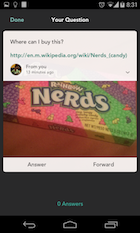 Ennél azonban egy kicsit összetettebb a dolog. Az appot elindítva bejelentkezhetünk a Twitter- és/vagy a Facebook-profilunkkal, a folyamathoz ugyanis az ismerősökre is szükség van. A keresési folyamathoz először egy fotót kell lőnünk, ami tartalmazza a kérdés tárgyát (illetve a galériából is választhatunk egyet), melyet ezután meg lehet vágni, elláthatjuk szöveggel, egy hivatkozással és ábrákkal, majd ki is lőhetjük a kérdést. Ezután ezek bele is kerülnek a Jelly-felhasználó ismerőseink folyamába, bárki válaszolhat rájuk, a választ pedig szintén bárki értékelheti. A jó válaszokért pontokat kapunk, ha pedig úgy gondolja az ember, bárkinek tovább is küldheti a függőben lévő kérdéseket.