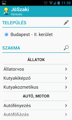 A JóSzaki app nem cicózik, elindítás után kapásból a szakmakereső nézetben találjuk magunkat. A főképernyő tetején a lakóhelyet állíthatjuk be (ezt megadhatjuk GPS- és szövegalapon is), az alkalmazás többek között ezt is figyelembe veszi a találati lista összeállításakor. A legnagyobb részt a kategóriák listája foglalja el, a tizenhárom főcsoport (állatok, autó/motor, egészség, egyéb, gyerekek/tanulás, ház/kert, informatika, művészet, pénzügyek, szállítás, szépségápolás, üzlet/iroda, vendéglátás) rengeteg további lehetőséget tartalmaz, így pontosan behatárolható a probléma. Természetesen szöveges keresés is elérhető, ezt a nagyítóra kattintva varázsolhatjuk elő.