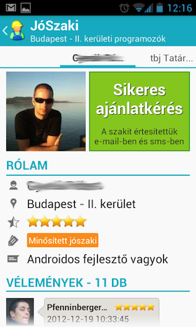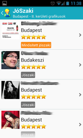 Az egyes foglalkozásokat kiválasztva egy újabb listát kapunk, mely az adott kritériumnak megfelelő szakembereket listázza. Megjeleníti továbbá az értékelést (ez egy ötpontos skála), a kapcsolódó címkéket (tanácsadó, JóSzaki vagy minősített JóSzaki), valamint a munkavégzés helyét is. A címkéket megérintve egy felugró ablakban szöveges formában is látható a minősítés. A szakikat kiválasztva a részletes nézetre érkezünk, ahol egy rövid leírást és a felhasználók szöveges visszajelzéseit is láthatjuk, valamint az ajánlatkérés is itt történhet. Ez egy nagyon egyszerű űrlap kitöltésével történik, meg kell adnunk egy email címet és a munka rövid leírását, opcionálisan fotókat és telefonszámot is mellékelhetünk. Ezeket az adatokat egyébként megjegyzi az app, így egy újabb ajánlat kérésekor nem kell mindent újra begépelni.