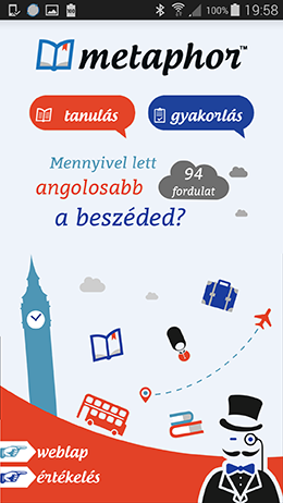 Még mindig semmi nem pótolja a személyes nyelvtanulás élményét, ám a technológia fejlődésével egyre több eszköze van az embernek, hogy nyelvtudását ápolja, fejlessze és bővítse. Szerencsére mostanában több színvonalas ilyen magyar fejlesztéssel is találkoztunk (Xeropan, Drops), most pedig Csigi Balázs androidos alkalmazását szeretnénk bemutatni. A Metaphor annyiban tér el a fenti alkalmazásoktól, hogy a már meglévő angoltudás finomítására fókuszál, így olyan angolos kifejezéseket és szófordulatokat segít bemutatni, megmagyarázni és elsajátítani, amelyekkel nem csak színesebben, hanem frappánsabban fejezhetjük ki magunkat idegennyelven, jó pontokat szerezve mondjuk egy brit turistával elbeszélgetve.