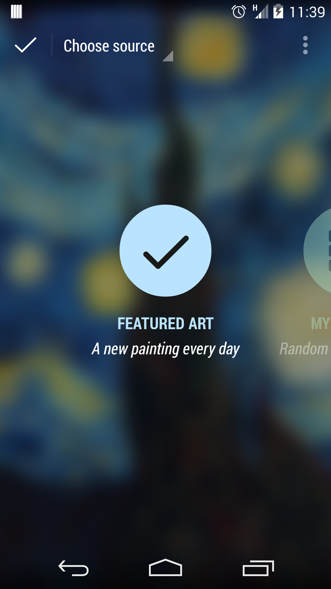 A Muzei nem egy klasszikus értelemben vett élő háttérkép, a többi versenyzővel ellentétben nem egy folyamatosan változó és mozgó valamiről van szó. Az alkalmazás mindössze annyit csinál, hogy a kiválasztott képet elhomályosítja, ami nem hangzik nagy számnak, élőben azonban igen jól mutat. Használhatjuk a telefon háttértárán lévő képeket, de akár internetes forrásokra is hagyatkozhatunk: a Featured Art opciót választva minden nap új háttérképet kapunk. Beállítási lehetőség ezen kívül mindössze kettő van, az elmosás (blur) és a homályosítás (dim) mértékét lehet a saját preferenciának megfelelően kalibrálni.