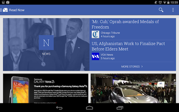 A felhasználói felület rendben van, a UI szépen illeszkedik az Android legújabb verziójához. A tartalmak listázása kissé a Google Now kártyáit idézi, a listák frissítése is a kereső (és a többi Google alkalmazás) pull to refresh (azaz a listák függőleges túlhúzása) megoldására hajaz. Negatívum viszont, hogy a cikkek tördelése nem mindig megfelelő (igaz, ez a vetélytársak esetében is előfordul, az általam használt Flipboard is képes fura dolgokra), érdemes megnézni például ezt a képernyőfotót. Mintha az említett rivális több tartalommal is rendelkezne, én személy szerint nem találtam meg mindent a NewsStand kínálatában, ám könnyen lehet, hogy ez fordítva is előfordul. Ezek mellett a NewsStand esetében is fennáll, hogy az internetről begyűjtött képek gyakran életlennek és pixelesnek tűnnek a kijelzőnél alacsonyabb felbontás miatt. Persze ez leginkább Full HD paneleken érhető tetten, és egyáltalán nem a hírolvasók hibája, az internetes tartalmak még nem minden esetben követték le a mobilkijelzők felbontásának ugrásszerű növekedését.