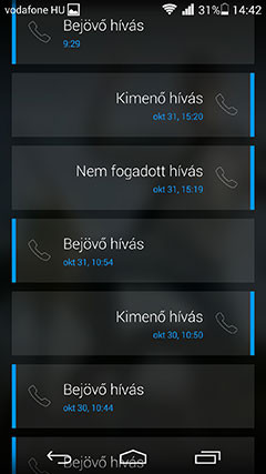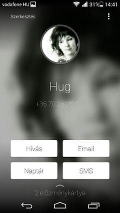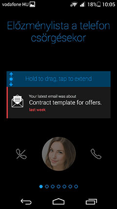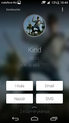 Ha a csempés képernyőt balra toljuk el, akkor a keresőbe csöppenünk, ami nagyon ötletes. Egy adott betűre bökve rögtön odaugranak a felül körhintaszerűen pörgő névkártyák, innen pedig vagy magukat a kártyákat húzogatjuk, vagy egy adott betűn az ujjunkat rajta tartva tudjuk gyorsan pörgetni az ismerőseink fejét. Egy adott névre kattintva telefonálni, SMS-t és emailt küldeni, illetve naptáreseményt létrehozni tudunk, alulról felhúzva az előzménykártyákat pedig időrendben látjuk, hogy mikor és milyen típusú interakciónk volt az adott emberrel. Ezt akkor is elő lehet csalogatni, ha bejövő hívásunk jön az illetőtől, így rögtön látjuk, hogy legutóbb mondjuk mit írt nekünk SMS-ben. Bejövő hívásnál egyébként a Ready egy vízszintes sávot tesz a gyári hívásképernyő fölé, amit ide-oda tudunk rámolni — ahová tesszük, azt megjegyzi az app, mondjuk pont az LG G3-nál nem bírtam úgy rámolni, hogy ne takarjon ki valamit.
