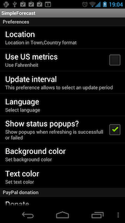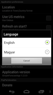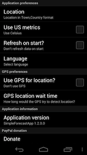 Az alap program a SimpleForecastApp névre hallgat, amely egy igen beszédes név. Az alkalmazás ugyanis tényleg nagyon egyszerű, mindössze egy főoldalból és egy, a beállítások számára fenntartott felületből áll. Előbbi az aktuális hőmérséklet és páratartalom mellett a szél erejét és irányát is jelzi, az időjárásról pedig egy kis piktogram és egy rövid szöveg is árulkodik. A felső sávban a négy napos előrejelzést olvashatjuk; a képeket megérintve egy rövid szöveges leírást is kapunk. A beállítások között a szokásos opciókat találjuk: a mértékegységek és a tartózkodási hely mellett nyelvet (angol vagy magyar) is választhatunk. A helymeghatározás lehet szöveges vagy GPS-alapú, valamint azt is megadhatjuk, hogy a program mennyi ideig várjon a GPS-adatokra.