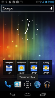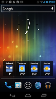 Mint azt már említettük, a minialkalmazást külön kell lerántatnunk a Marketről. A SimpleForecast névre hallgató widget 4x1 helyet foglal el a főoldalon, az aktuális időjárás mellett a három napos előrejelzést is tudtunkra adja. Az egyes napoknak megfelelő képecskéket megérintve egy rövid szöveges leírást kapunk az adott napra várható időjárásról, amely mindössze pár másodpercig látszik. A widget beállításai között az előzőekhez hasonló opciókat találunk. Megadhatjuk a tartózkodási helyet (itt valamiért nincs GPS-alapú pozicionálás), a használni kívánt mértékegységet, a frissítési intervallumot, a háttérszínt és a betűk színét. Mindkét alkalmazás a Google időjárás-szolgáltatásától szerzi az adatokat.
