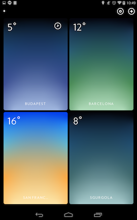 A program viszont leginkább a megjelenésével hódít. A képernyőfotókat elnézegetve nem értettem, hogy mitől olyan nagy szám ez a szoftver, telepítés után viszont azon kaptam magam, hogy percek óta csak lapozgatok a felületek és funkciók között. A vizualitás nincs túlbonyolítva: minden várost egy kártya testesít meg, mely színátmenetes háttérrel rendelkezik; a gradiens az aktuális időnek és napszaknak megfelelően változik. És ennyit is tud az app, ám ez bőven elég, hogy ne kelljen szégyenkeznie a vizualitást kissé túlzásva vivő, esőcseppet-a-képernyőre és szemembe-süt-a-nap effektekkel operáló konkurencia mellett.