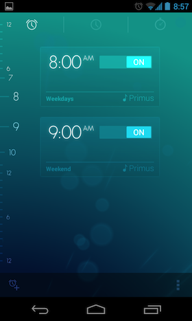 Indítás után a főképernyő tárul a felhasználó szeme elé, mely három fő részre osztható; ezek értelemszerűen egyben a funkciókat is csoportokra bontják. A baloldali lapon az ébresztőink listája látható, az új riasztások felvételének módja nagyon menő (érdemes megtekinteni az alábbi videóban). Az egyes elemeket egy oldalirányú mozdulattal törölhetjük, az ébresztések mellé különféle elvégzendő feladatokat rendelhetünk (a telefon megrázása, egy matematikai probléma megoldása stb.), Ezek mellett aktiválható az úgynevezett smart rise funkció is, mely a beállított időpont előtt fél órával sül el egy halk melódiával, melyre a megfelelő állapotban (azaz alvási ciklusban) jóval könnyebben ébred fel az ember. A telefon elforgatásával szundi módba kapcsolhatunk, a készüléket felemelve az alkalmazás automatikusan csökkenti a riasztás hangerejét. Nagyon hasznos továbbá, hogy a riasztásokat szinkronizálni is lehet, amennyiben az ember több készülékre is feltelepíti az alkalmazást.