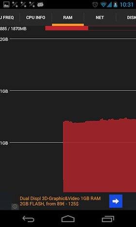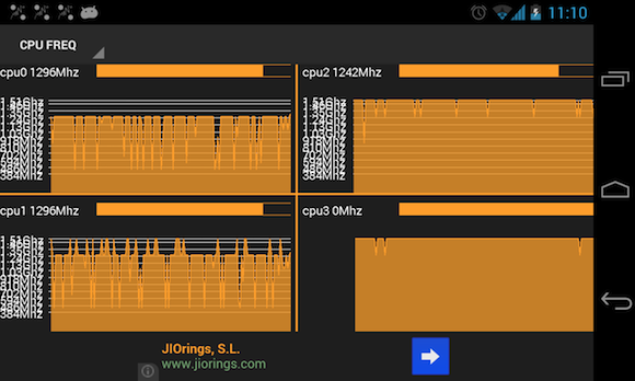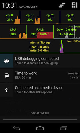 A UI kapcsán három kisebb problémát találunk mindössze: az értesítések megjelenítésénél tapasztaltam: az app külön notificationként kezeli az egyes sorokat, így ha minden adatot látni szeretnénk, három permanens értesítési ikont kapunk, ami egy kicsit zavaró lehet. Fektetett orientáció esetén pedig a tab alapú vezérlés helyett egy lenyíló menü látható a felső sávban (azaz az ActionBarban), itt maradhatott volna az álló kijelző esetén tapasztalható megoldás. A harmadik észrevétel szintén a fektetett orientációhoz kapcsolódik: zsúfoltabb felületeken (például egy négymagos CPU kihasználtságát monitorozva) a grafikonokon látható címkék hajlamosak egymásra csúszni.