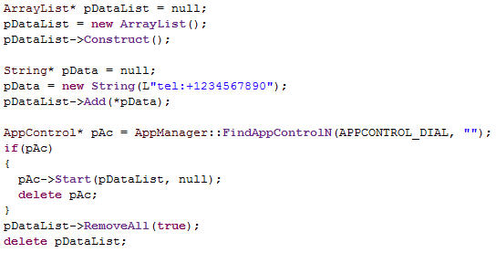 Első lépésben érdemes összerakni a telefonszámot tartalmazó adatstruktúrát. A vezérlőt egy Osp::Base::Collections::ArrayList mutatóval kell megetetnünk, amely egy megfelelő formátumú Stringet tartalmaz. Ez annyit tesz, hogy a telefonszámot meg kell előznie egy tel: szövegnek, ebből fogja felismerni a vezérlő, hogy mit kell beleírnia a tárcsázóba. Ez után az AppManagertől el kell kérnünk a megfelelő vezérlőt, ezt jelen esetben a tárcsázót jelképező APPCONTROL_DIAL paraméterrel tehetjük meg. Innen már egyszerű dolgunk van, egyszerűen csak el kell indítanunk a dialert a Start() függvénnyel, amelynek a bemenője a telefonszámmal feltöltött lista.
