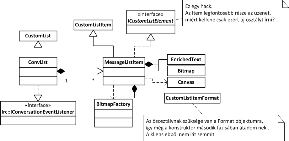 Feleslegesnek érzem a listaelem viselkedésének három osztályra bontását, valamint az üzenetforgalmat is figyelni kell, így a CustomList és a CustomListItem osztályokból is leszármazottakat készítettem. A ConvList annyit ad hozzá az őséhez, hogy az Irc::IConversationEventListener interfészen keresztül érkező, megjelenítendő üzeneteket ő fogadja, létrehozva és hozzáadva a listaelemeket. A MessageListItem összevonja a korábban felsorolt osztályokat, ahogy a következő ábrán látható.