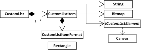A CustomListItem osztály a lista egy sorát reprezentálja, ennek példányait adhatjuk hozzá a listához. Nem szükséges leszármazott osztályt készíteni, de praktikus, mert ellenkező esetben sok konfigurálást kell elvégezni az osztályon kívül. A rajta megjelenő feliratok, képek illetve egyedileg rajzolt elemek helyét a CustomListItemFormat osztály definiálja, ez gyakorlatilag egy hashmap, mely int azonosítókat rendel a befoglaló téglalapokhoz és néhány egyéb paraméterhez. Amint a formátumot hozzárendeltük a listaelemhez, elkezdhetjük a tényleges adatok feltöltését a SetElement metódusok segítségével. Az egy soros szövegek és sima Bitmapek beállítása triviális, a dolgok az egyedi elemeknél bonyolódnak el.