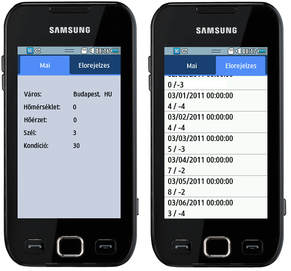A felhasználói felületet ehhez egy kissé átszabtam: a tartalmakat két ScrollPanelre pakoltam ki, amelyek között a felső sávban látható füleket megérintve váltogathatunk. A bal oldalit megérintve a pillanatnyi időjárást láthatjuk, a jobb oldali pedig az előrejelzést rejti.