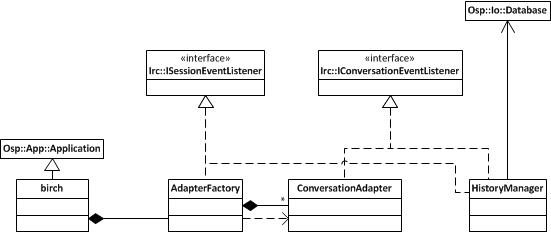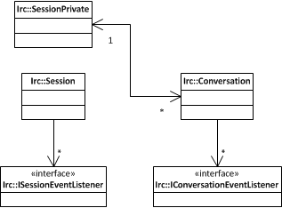 A libircclient-qt könyvtár forráskódjának vizsgálata során találtam egy érdekes mintát, melyet kisebb módosításokkal átveszek: a csatornákkal és felhasználókkal folytatott kapcsolatot a Conversation osztály (eredeti nevén Buffer) reprezentálja. A lényeg az, hogy míg az előbbiből egyetlen példány létezik (legalábbis amíg nem multiszerver-képes a kliens), az utóbbiakból több is létrejön, konkrétan ahány aktív beszélgetést tart fenn a felhasználó; továbbá üzeneteket küldeni és fogadni csak a Conversation interfészén keresztül lehet. Ez csökkenti az érvénytelen üzenetek vagy az inkonzisztens állapot valószínűségét.