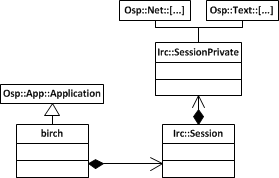 Mivel központi szerepet tölt be és bárhonnan elérhető — szemantikailag singleton —, az alkalmazásosztály ideális hely az IRC kapcsolat elhelyezésére. Az IRC szerverrel felépített kapcsolatot a Session osztály reprezentálja, elrejtve a bada hálózatkezelést és egyéb komponenseket a tisztaság kedvéért — ezeket a SessionPrivate osztály kezeli, a Session csak egy bridge a kliens és ez között. Mivel a hálózati műveletek alapvetően aszinkronok, observerek teszik lehetővé a kapcsolat állapotváltozásainak kezelését.